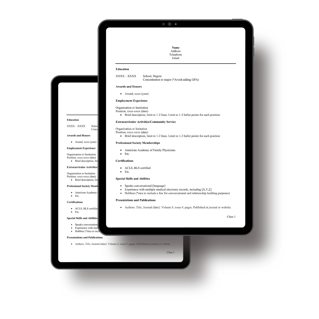 This template is optimized to help you effortlessly display essential certifications like ACLS and BLS, membership societies, and your technical proficiencies, including electronic medical records (EMRs). Make it easy for potential employers to see that you’re qualified and ready to step into a role confidently.